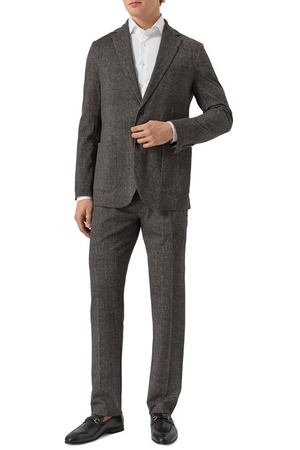 Для пошива однобортного пиджака с прорезным нагрудным и накладными боковыми карманами использовали фактурную шерсть первого пострига с шевронным узором. Модель с двумя шлицами сзади выполнили без подклада, поэтому она получилась легкой.