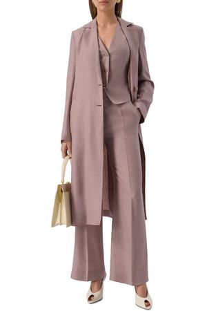 Двубортный жакет с острыми лацканами и двумя шлицами выполнили из кашемировой ткани с добавлением шелка и льна. По бокам расположили втачные карманы.