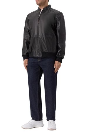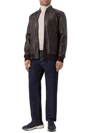 Брюки со стрелками и защипами под поясом с широкими шлевками для ремня дополнили отворотами на манжетах и четырьмя карманами. Укороченную модель в полоску сшили из костюмной ткани, сотканной из шерсти первого пострига.