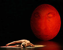 Немыслимая встреча с двойником (Максим Диденко), желчно пародирующего выбрасывание рук и муки корчащегося напротив Адасинского, игра в красный (кишки наружу?) шнурок; луна, месяц с лицом вождя — автора; картонные бутылки приглушенных оттенков; танец человека- пчелы и зазывно подпрыгивающих сиамских близнецов — все это образует целый лабиринт не всегда доступной пониманию символики.