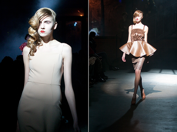 Штрихи графита были на приглашениях, их же можно было увидеть на нескольких платьях из новой коллекции Газинской. Под музыку Нины Симон и Roxy Music модели появлялись из светлого дыма по трое. Белокожие девушки с акцентированно красными губами, с роскошными волосами, уложенными на бок волной в стиле двадцатых, выходили в платьях, оформленных крупными манжетами и объемными воланами.