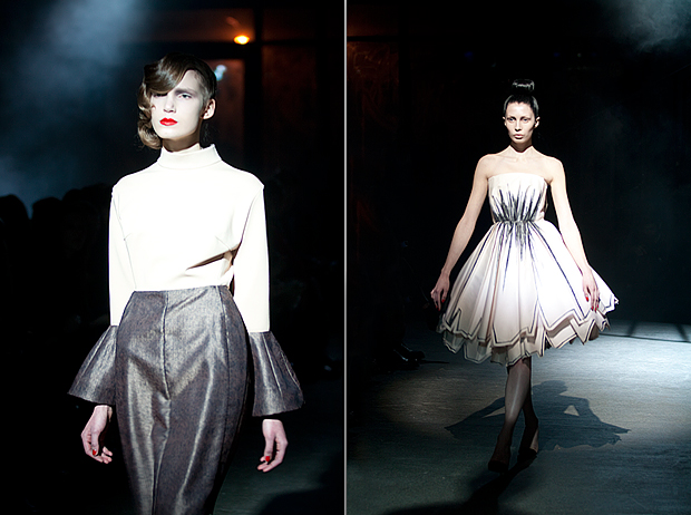 Штрихи графита были на приглашениях, их же можно было увидеть на нескольких платьях из новой коллекции Газинской. Под музыку Нины Симон и Roxy Music модели появлялись из светлого дыма по трое. Белокожие девушки с акцентированно красными губами, с роскошными волосами, уложенными на бок волной в стиле двадцатых, выходили в платьях, оформленных крупными манжетами и объемными воланами.