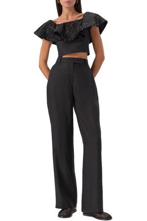 Боди с отделкой пайетками выполнили из сетчатого текстиля и более плотной гладкой ткани. Модель с широкой бретелью-халтер, застегивающейся сзади, дополнили тонкой перемычкой на открытой спине.