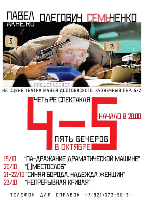 Эти работы созданы за 7 последних лет. В разных составах в них участвуют четверо: Алиса Олейник, Владимир Волков, Максим Диденко и Павел Семченко. На протяжении пяти вечеров в театре музея Ф. М. Достоевского публике будут представлены четыре театральные работы: