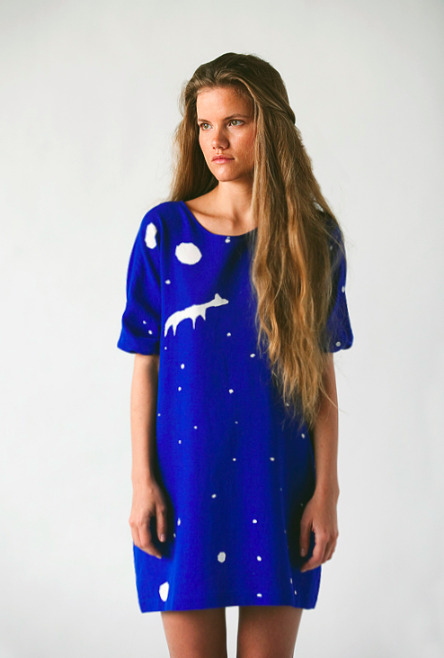 Идея. Синий цвет символизирует глубину света и пространства, а точки на синем - хаотично расположенные в этом пространстве звезды. История животного, путешествующего по Вселенной.