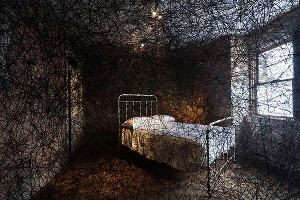 Японская художница Тихару Сиота представила выставку «Следы памяти» в новой галерее музея современного искусства Mattress Factory. Ее инсталляция сразу производит угнетающее впечатление: по всему периметру несколько комнат опутаны бесконечной нитью черного шпагата. Сам интерьер вторит замыслу автора: выставочное пространство напоминает покинутый дом с паркетом на полу, кирпичными стенами, столами, стульями и кроватью.