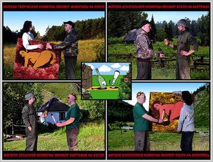 В «винзаводовской» выставке Группы ПГ «Это конец» - лайт-боксы и видеоскульптуры, изображающие «кровавую резню», «войну всех против всех», скорый и неминуемый апокалипсис, после которого, однако, «новый веселый человек построит новый радостный мир». Все это в русле, например, участия популярных среди анархистов и антифа-скинхедов художников из ПГ в довольно нашумевшей коллективной выставке «Мусор» («против ментовского беспредела»), или же их проекта «Либертарные коммуны будущего»: